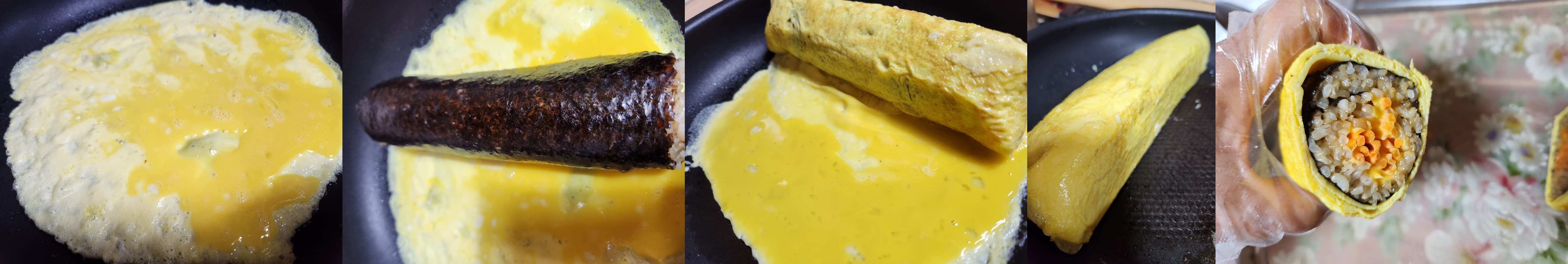 ⑤ 달걀을 풀어 준 후 후라이팬에 얇게 펴고 ④번 김밥용 김으로 싼 볶음한 야채밥을 올리고 돌돌 말아줍니다