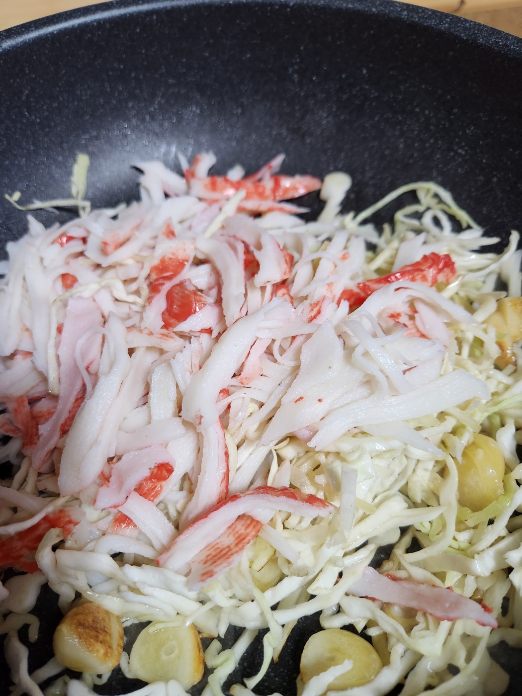 ④ 마늘이 투명해지면 왕고들빼기, 양배추, 몬스터크랩맛살을 넣고 볶아줍니다