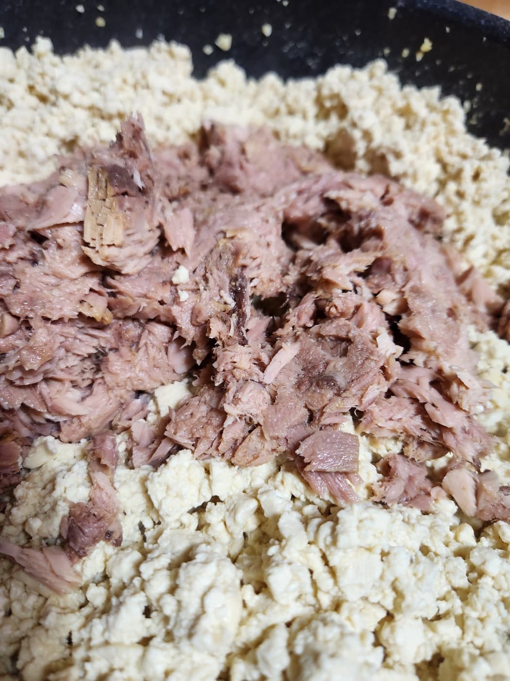 ⑤ 두부가 고슬고슬해지면 기름을 분리한 참치를 넣어주고 양파고추장(일반 고추장도 가능)을 3스푼 정도 넣어줍니다