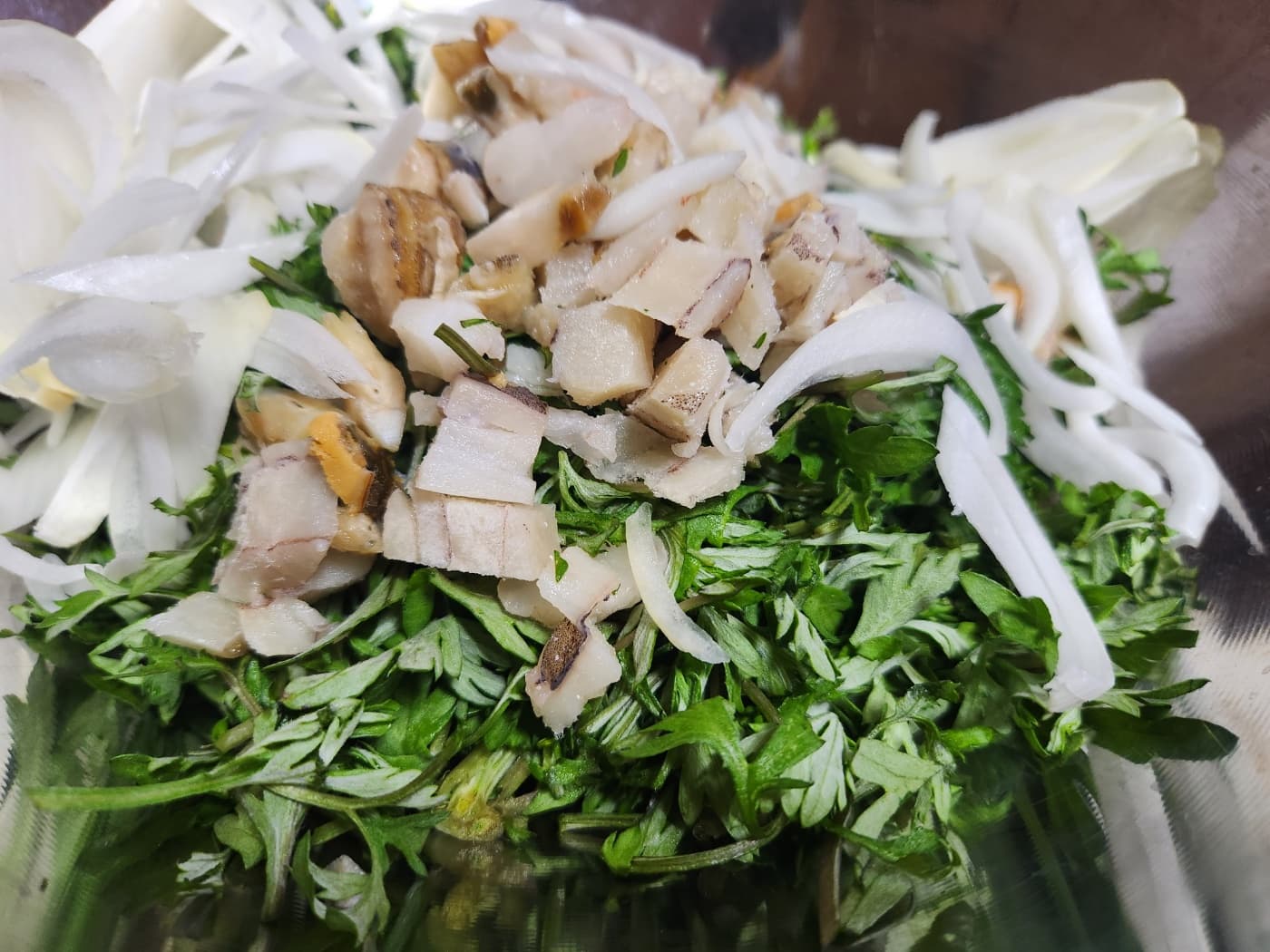 ① 쑥은 세척하고 당근과 양파도 세척한 후 채를 썰어서 준비합니다
